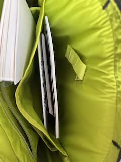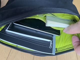 写真は筆者の普段使いのベルニナパック!、ほぼ日手帳にiPadにA4のノートとA5のリングノートなど、中のポケットには実用的なものがきっちり収納できます。